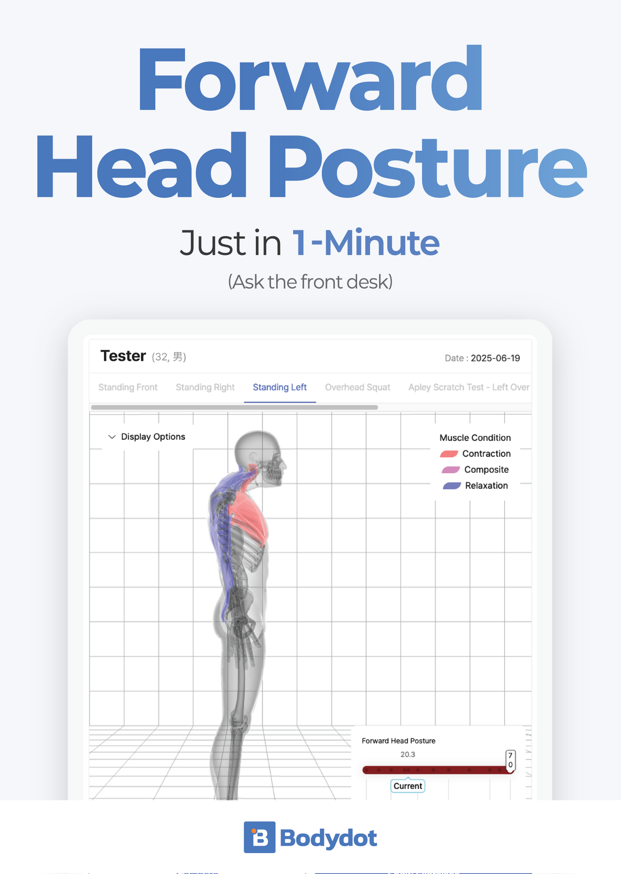 從「靜態」延伸至「動態」: 許多昂貴設備只能評估站姿。Bodydot 不僅能做靜態體態分析,更能執行過頂深蹲 (Overhead Squat)、單腿站立等功能性動態篩查 (FMS),精準抓出運動過程中的動態代償風險。