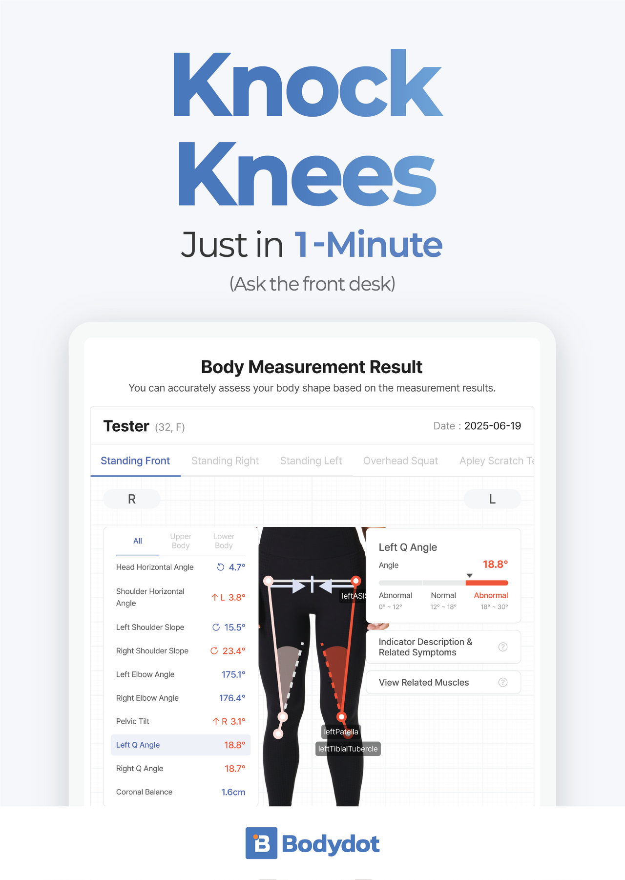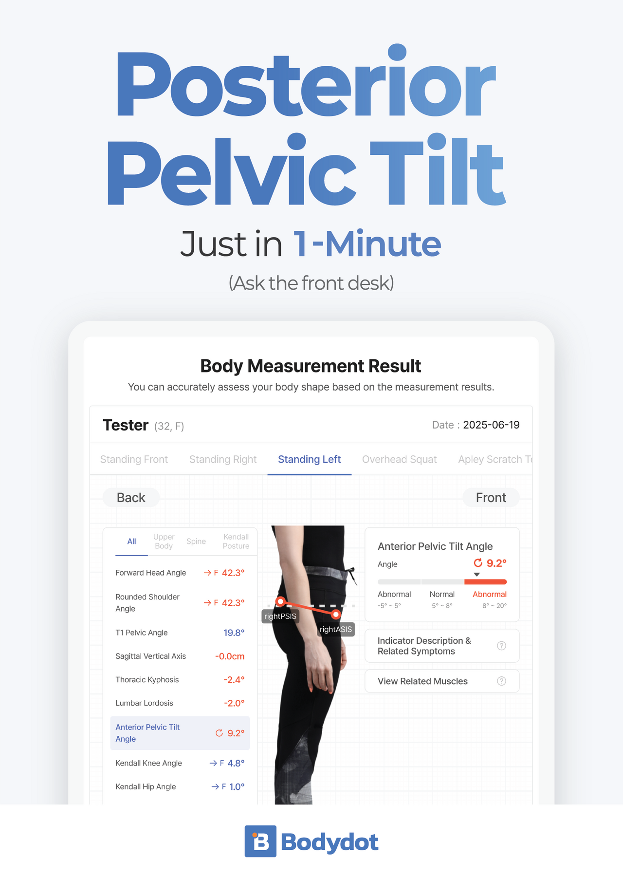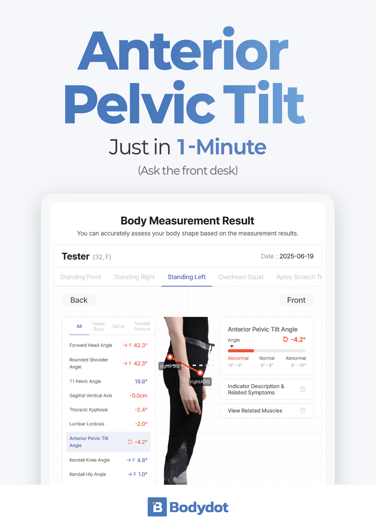 因為 BIA 設備測量的是「成分(量)」,卻測不出「排列(質)」。 Bodydot AI 體態檢測儀 正是為了填補這塊關鍵拼圖而生。它能精準判讀骨盆前傾、高低肩、脊椎側彎與關節活動度受限,告訴您「肌肉與骨骼是否在正確的軌道上運作」。
