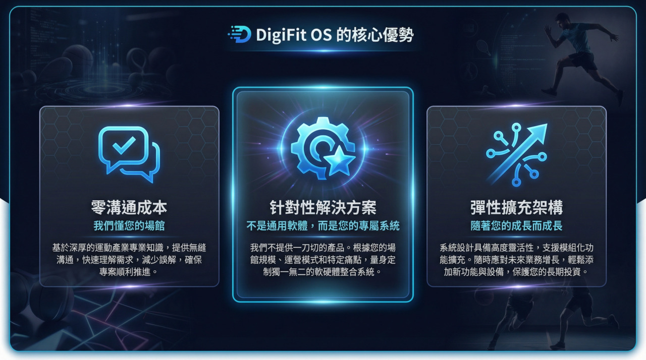 DigiFit OS 的優勢: 我們不是讓您從零開始,而是基於我們已有的運動領域專業知識,快速為您打造符合市場期待的系統。