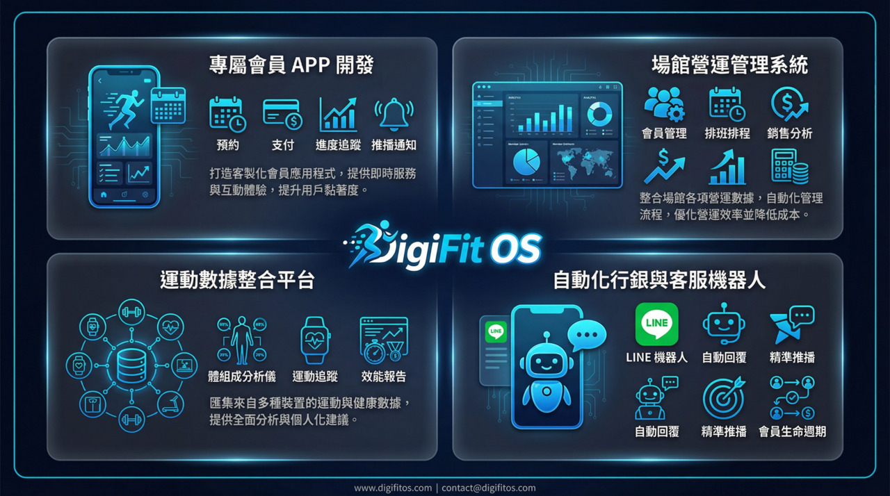 DigiFit OS 深知這個痛點。 我們不是單純的軟體開發商,而是深耕運動產業多年的數位轉型專家。我們懂場館經營者的語言,也懂教練與會員的使用習慣。這就是為什麼我們能為您打造不只是「可用」,而是「好用」、「能帶來營收」的專屬系統。