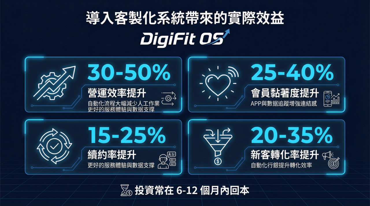 •續約率提升 15-25%: 透過更好的服務體驗與數據支撐,會員更願意續約