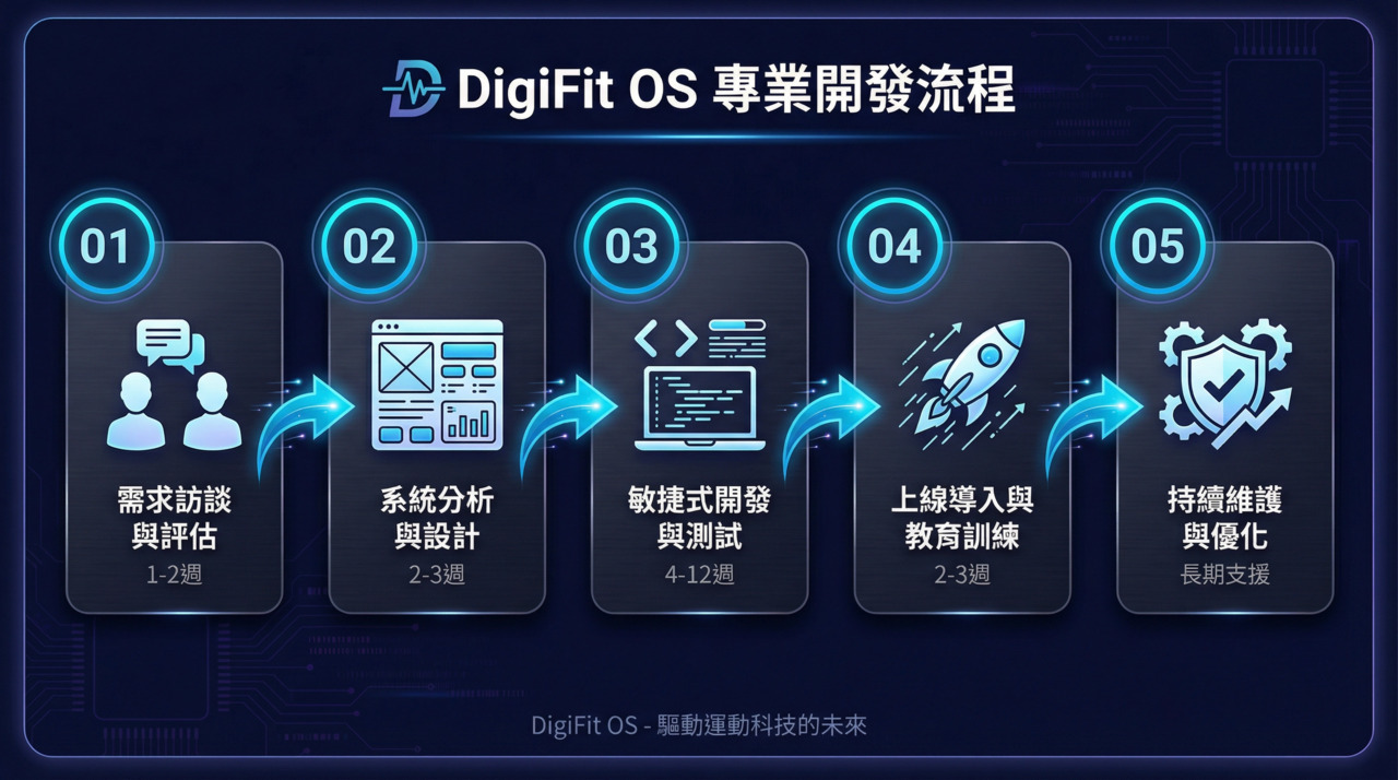 傳統軟體開發流程往往耗時冗長,因為開發商需要從零開始理解您的業務。而 DigiFit OS 已經在運動場館領域積累了深厚的實務經驗。